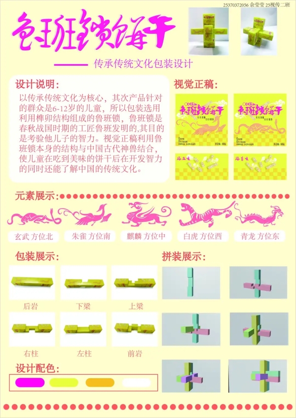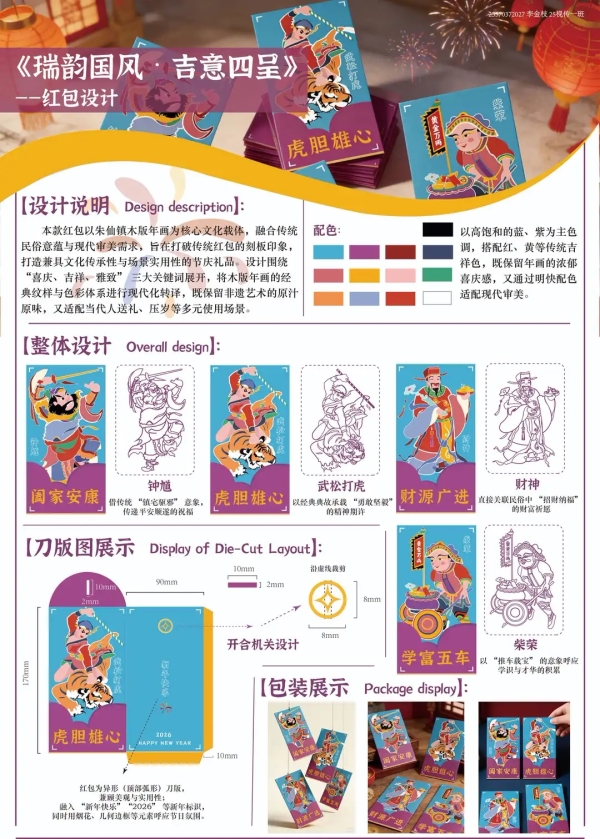 在展出的作品中,余莹莹同学以儿童饼干包装为切入点,结合中国传统鲁班锁的榫卯结构,设计出可重复组装、兼具趣味性与环保意义的包装方案,体现了“寓教于乐”与绿色可持续的设计理念。张溪原同学运用再生纸浆材料,融合植物形态与传统器物造型,为无火香氛打造了一系列自然朴素、富有东方美学的包装,探索了材料再生与视觉叙事的有机结合。李思雨同学则以精确的视觉语言为核心,为花茶产品构建了清晰而雅致的包装系统,通过色彩、图形与版式的协调,传递出产品的自然属性与品牌调性。李金枝等同学从不同角度探索了红包的创意设计,在交互上与意义表达上做出了不同的探讨。同学们都在课程中取得了不错的进步。